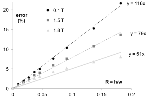 Measurement error of B-coil for various ratio of hole diameter h to coil width w.