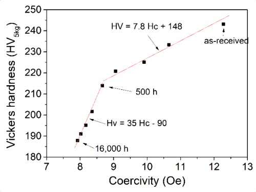 Relationship between Vickers hardness and coercivity in the P91 heat-resistant martensitic steel with different thermal ageing durations.