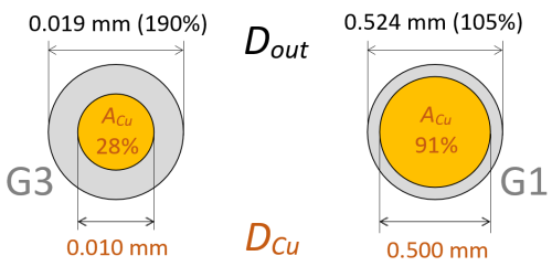 Enamelled wire 0.01 mm grade 3 (G3) has proportionally much larger proportion of insulation in the cross-sectional area than 0.500 mm grade 1 (G1) wire.